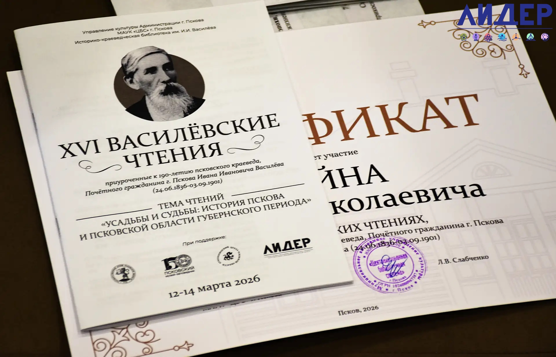 На ХYI краеведческих чтениях , посвященных 190-летию Ивана Ивановича Василёва, псковского краеведа и Почётного гражданина города Пскова, ГАОУ ДО «Лидер» выступает партнером историко-краеведческой библиотеки.